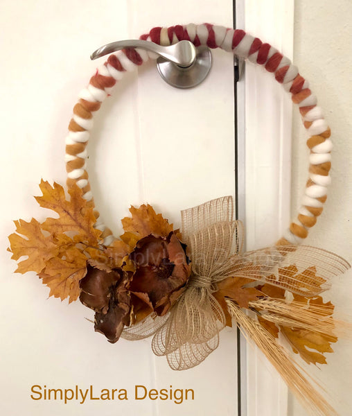 Yarn hand-wrapped wreath in the warm colors of gold, orange, and burgundy, decorated with naturally dried palm cap flowers, dried autumn leaves and golden wheat. Finished off with a natural ribbon. Diameter 13”